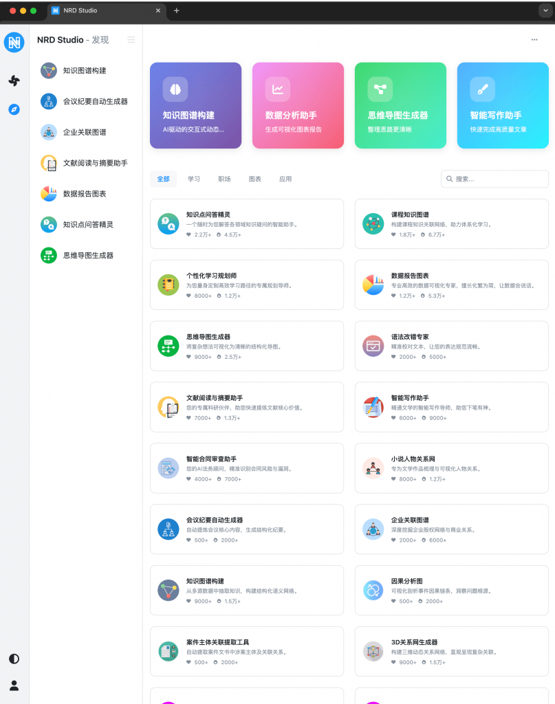 NRD Studio是自主研发的原创软件,内置可视化编辑器,零代码创作,属于知识图谱领域的创新之举,主界面如下图: