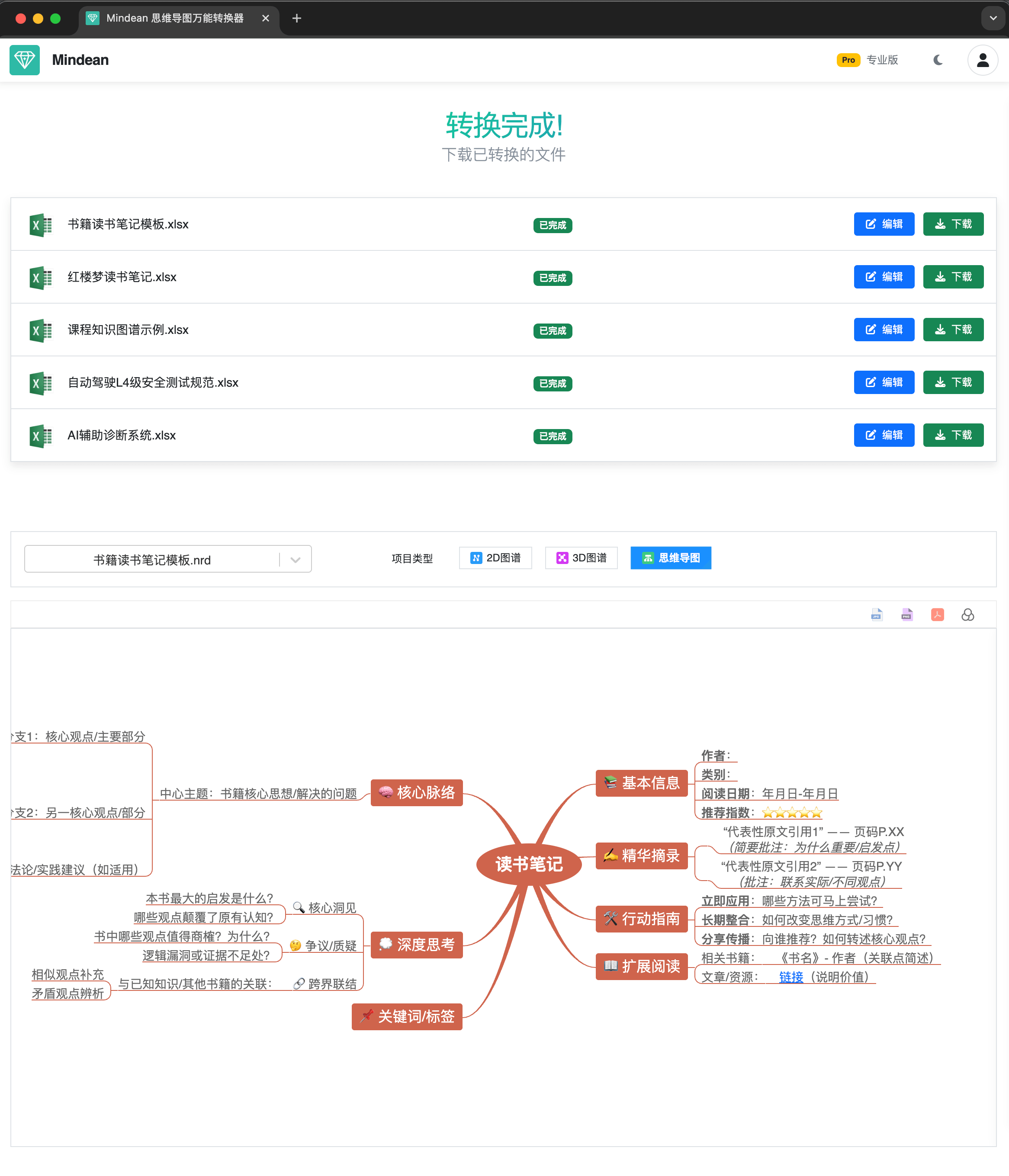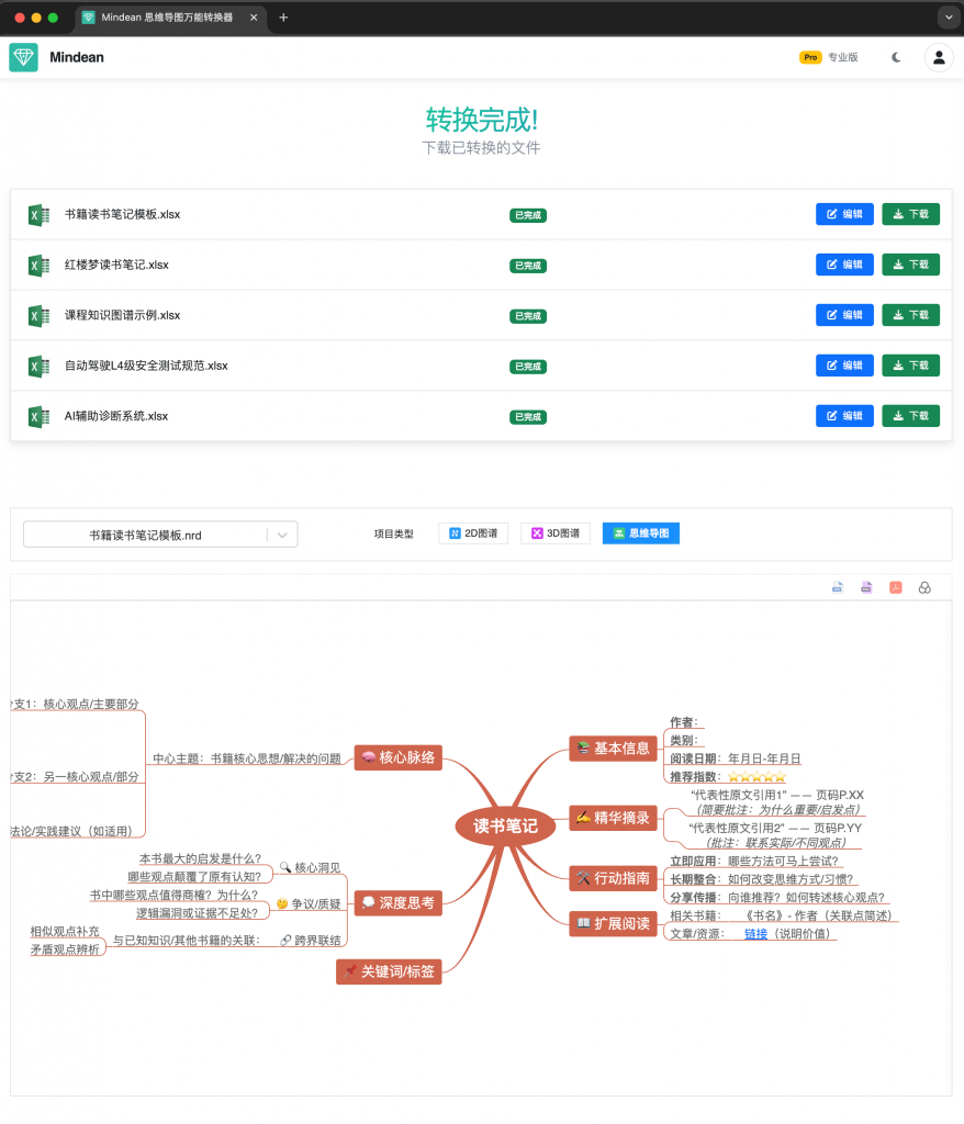 Mindean支持批量转换多个脑图文件,转换成功的思维导图,右侧有【编辑】和【下载】两个操作按钮。