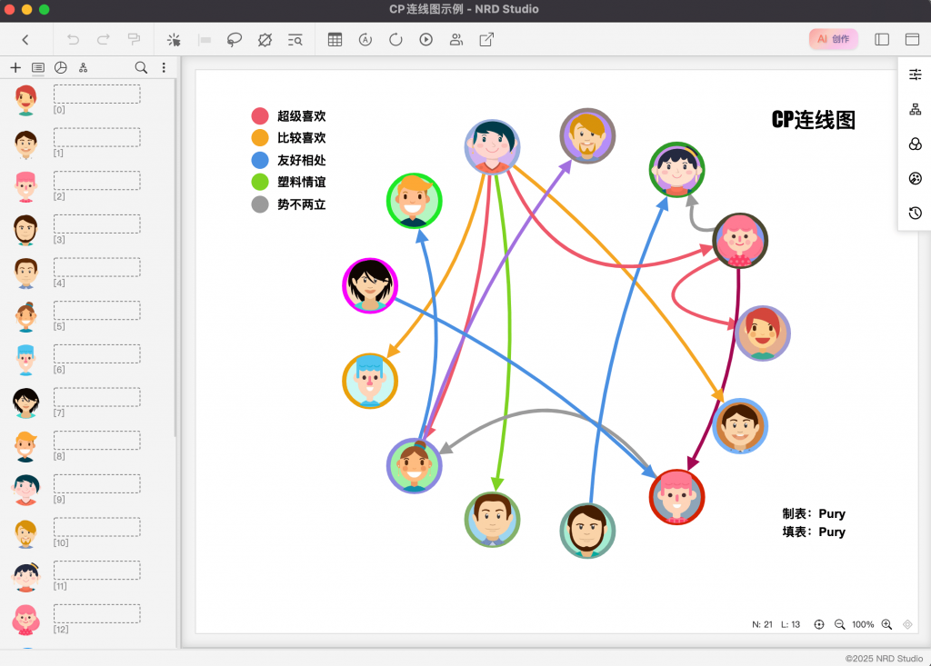 MuseOC特色功能之一是OC设定面板编辑器,内含关系网绘制功能,参考效果: