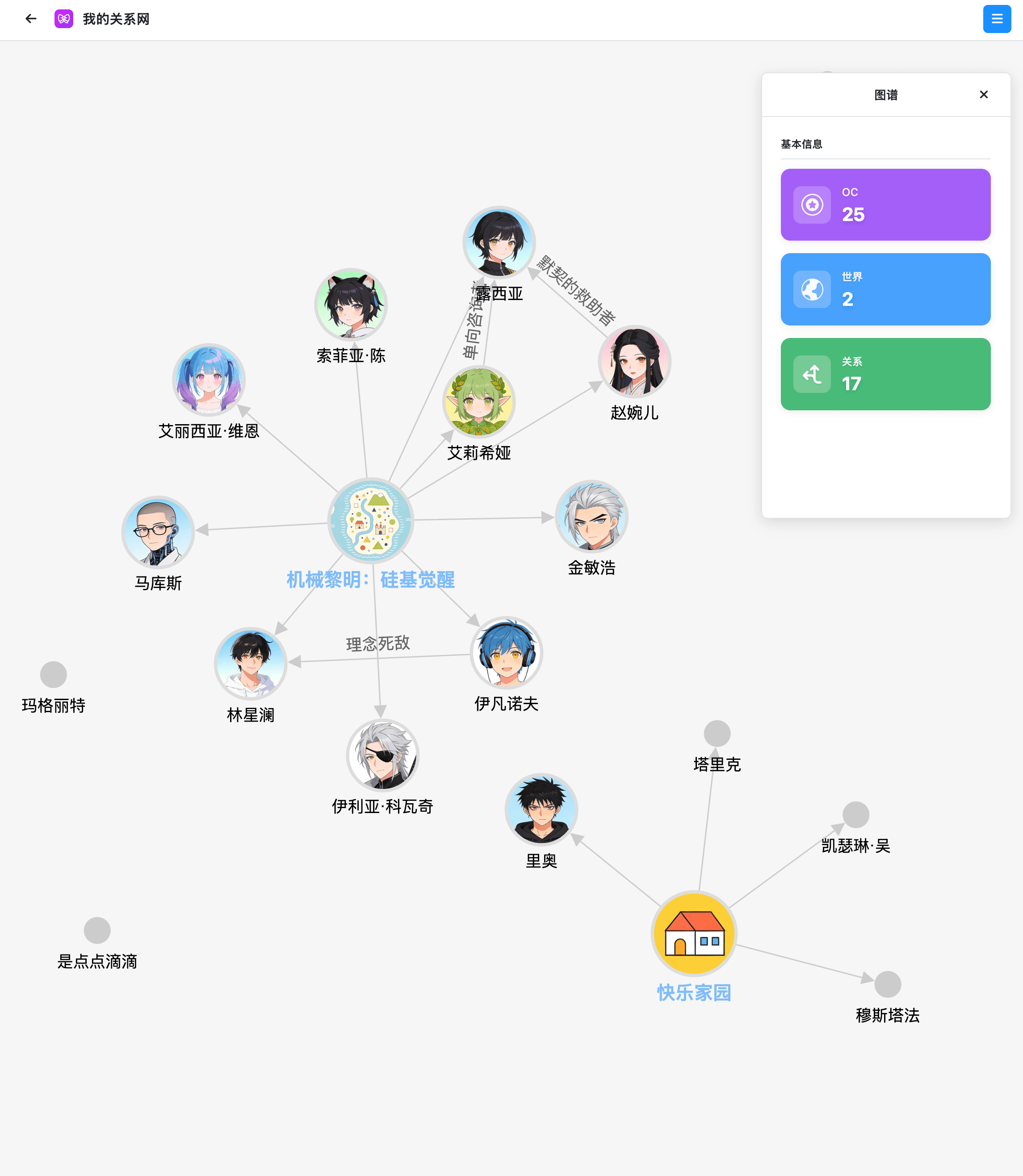 不同于NRD Studio的关系图,MuseOC中每个OC属于项目级别的对象,扁平化管理,各个OC项目之间均能建立关系。